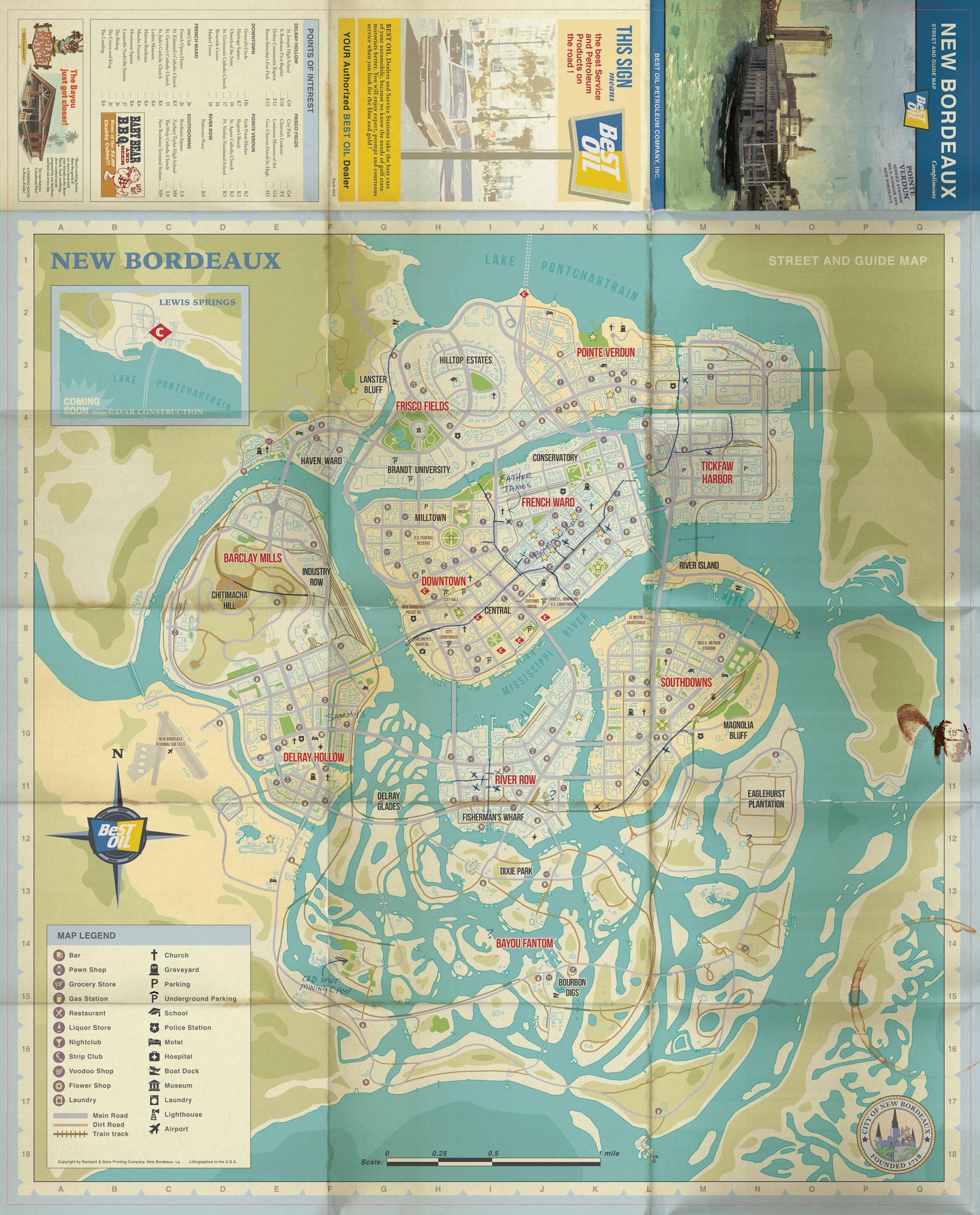 Semi-final world map design for MAFIA III. Exact layouts and folds were based on established print templates for Xbox One, PS4 and PC box sizes. (Details may have changes for final printed maps)